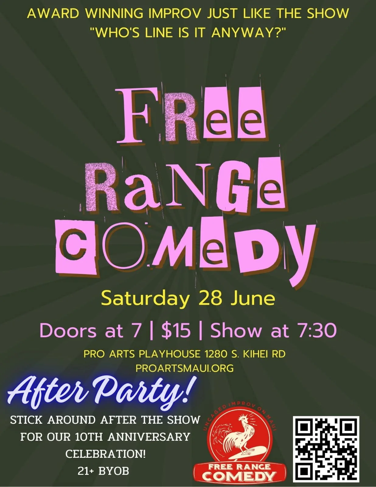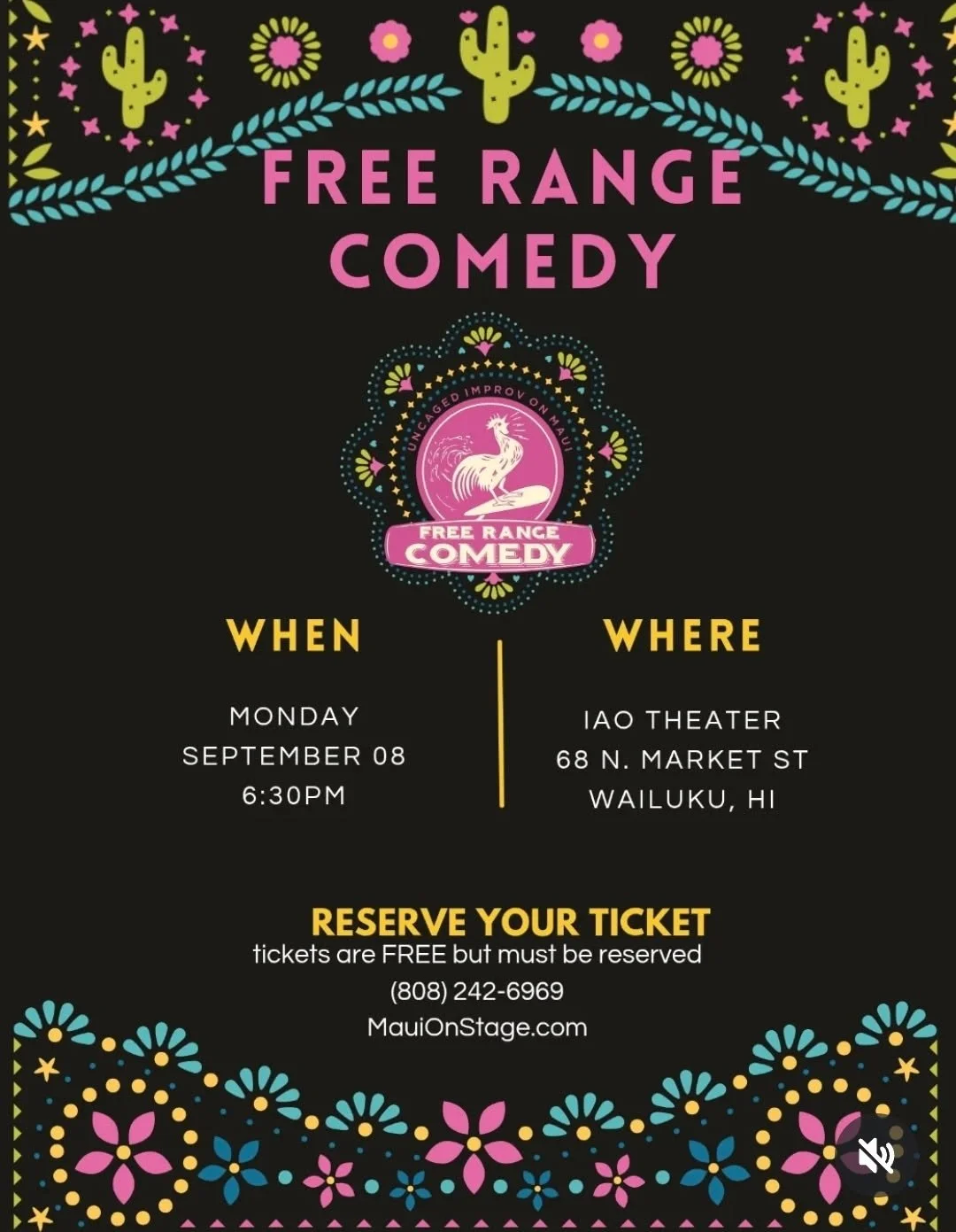 Not a typo it’s a Free Range show for FREE!!! Bring the whole family for organic made, up comedy. Free Range will be part of the Maui OnStage Ono-(One Night Only) Series at the Historic Iao Theater in Wailuku. 6:30 doors open at 6pm.