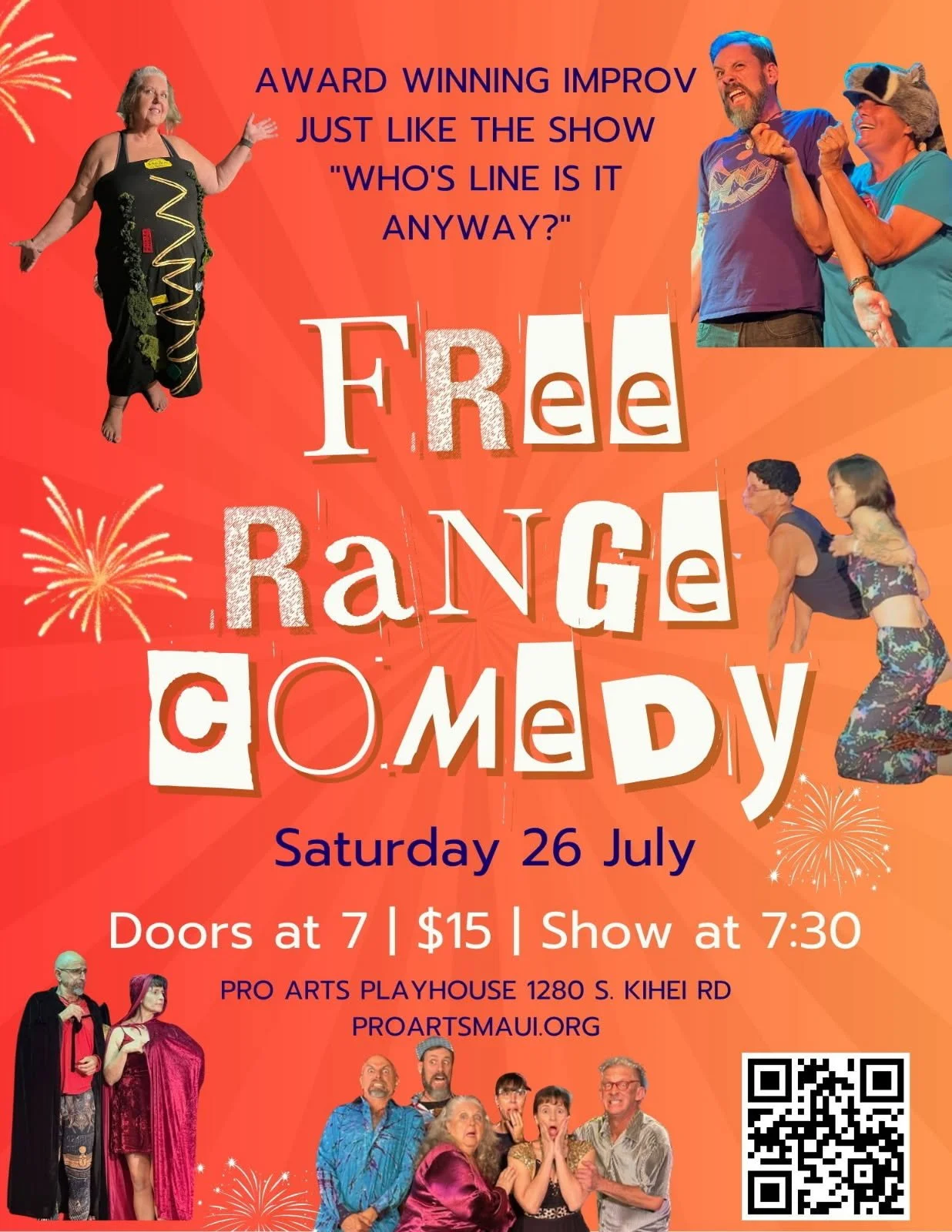 Come join Maui's award winning Impov Team Saturday, July 20, 2024 at ProArts Playhouse in Kihei guaranteed to crack you up! The fun starts at 7:30p. $15